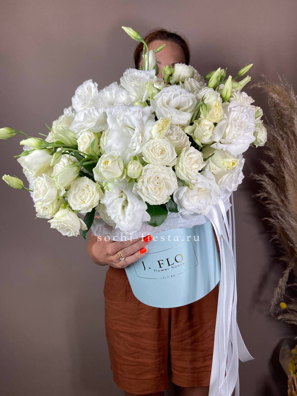 Пятьдесят пять роз двух сортов образуют монументальную композицию с выраженным присутствием в пространстве. Крупные бутоны создают плотную текстуру и заполняют объём без пустот. Впечатление масштаба и продуманной гармонии.