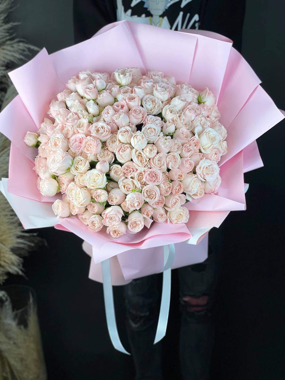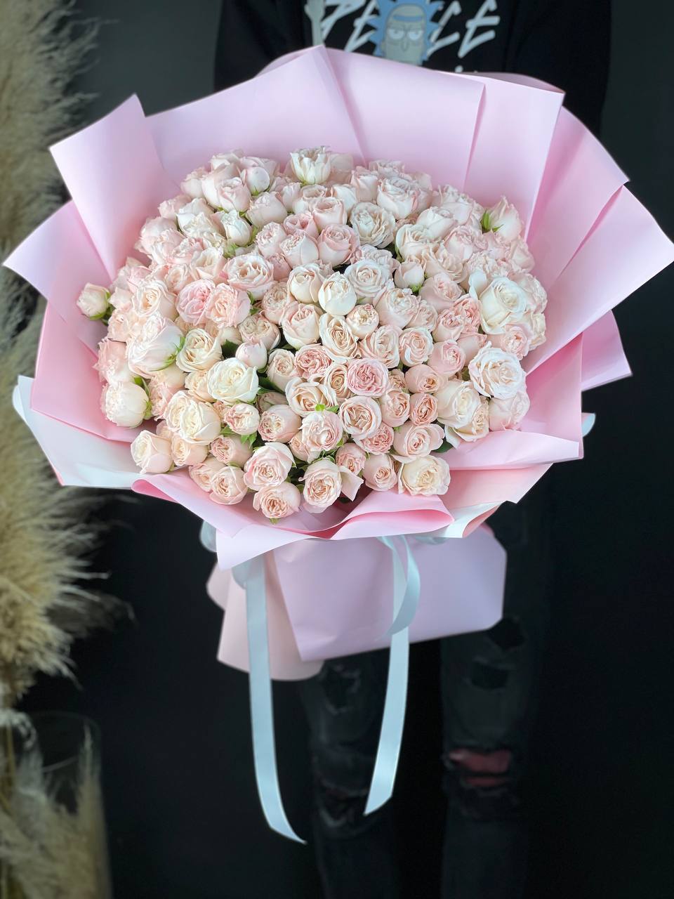 Пятьдесят один белоснежный бутон собран в плотный букет с мягким ритмом раскрытия. Кустовые розы создают воздушный объем и заполняют пространство светом.
