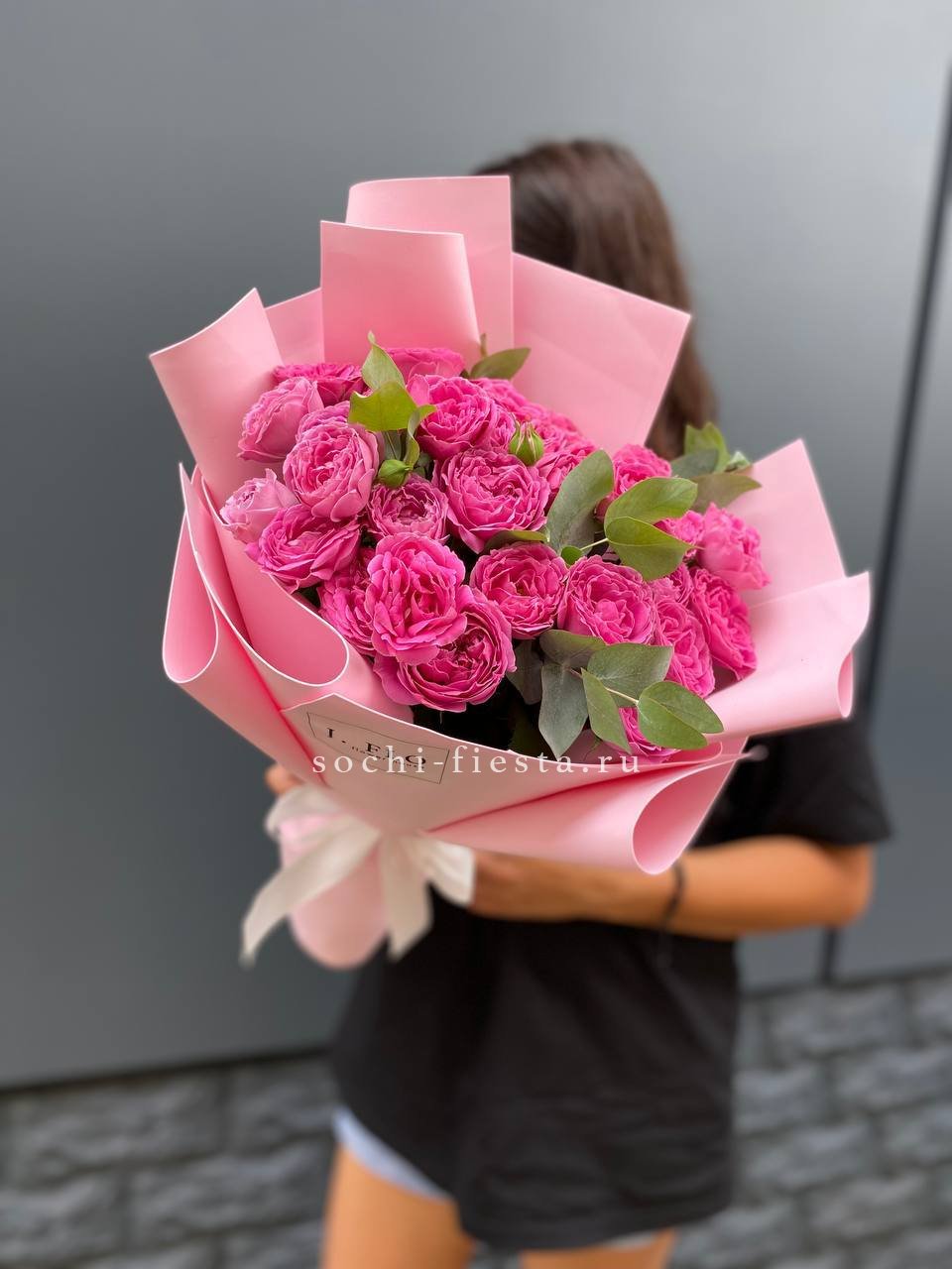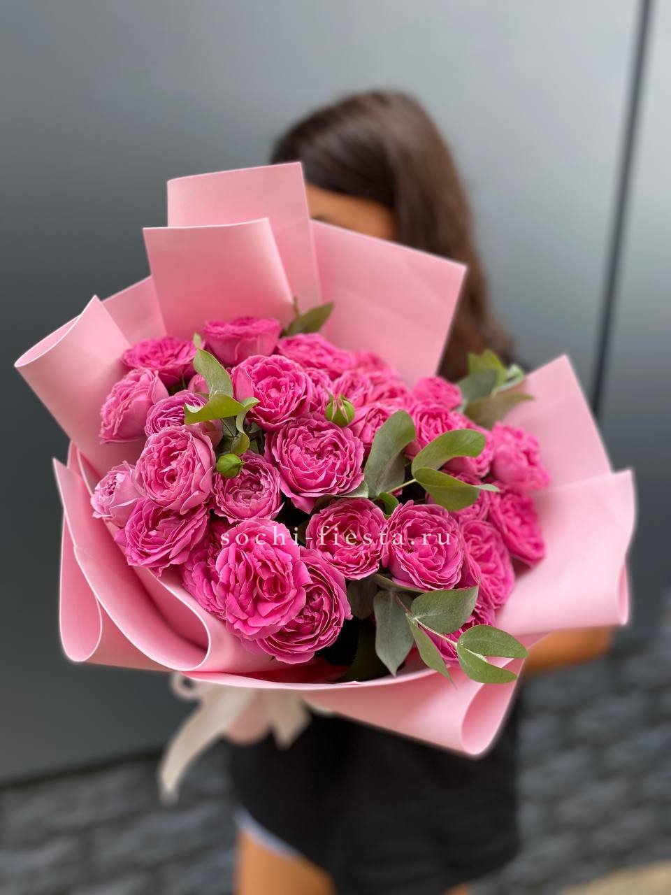 11 пионовидных кустовых роз розового оттенка, оформление.