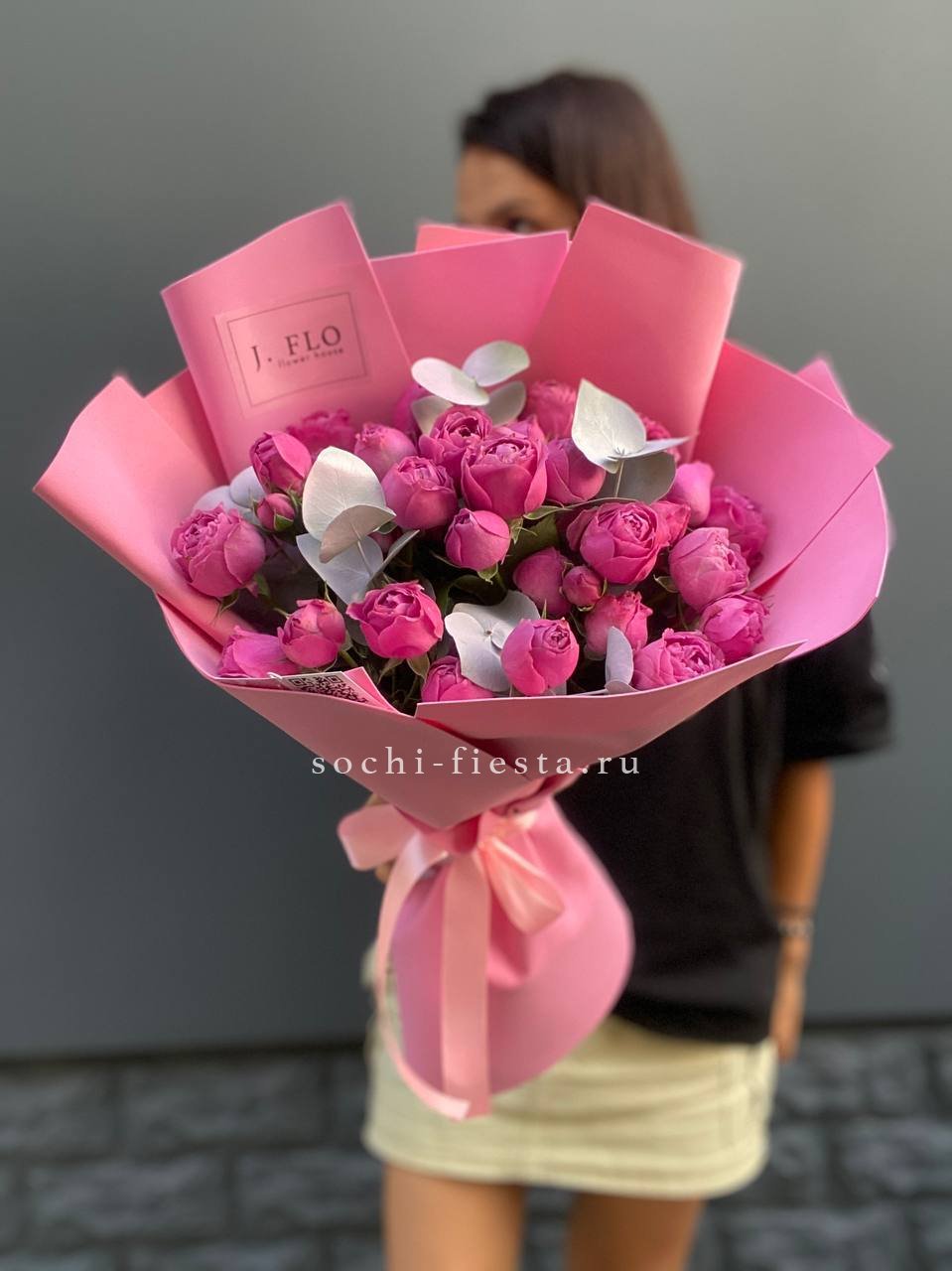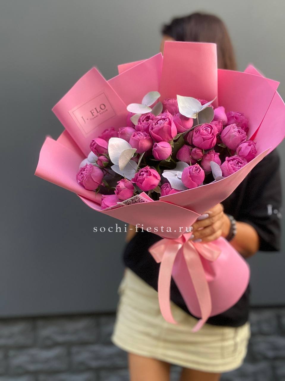 11 пионовидных кустовых роз Bombastic (или Porcelain Lace), дизайнерское оформление, лента.