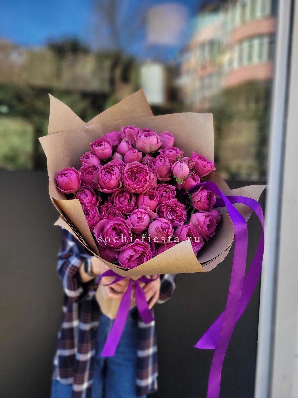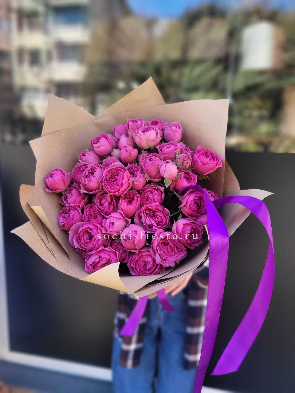минимальный состав: 9 лавандовых пионовидных кустовых роз, лента, упаковка на выбор.
