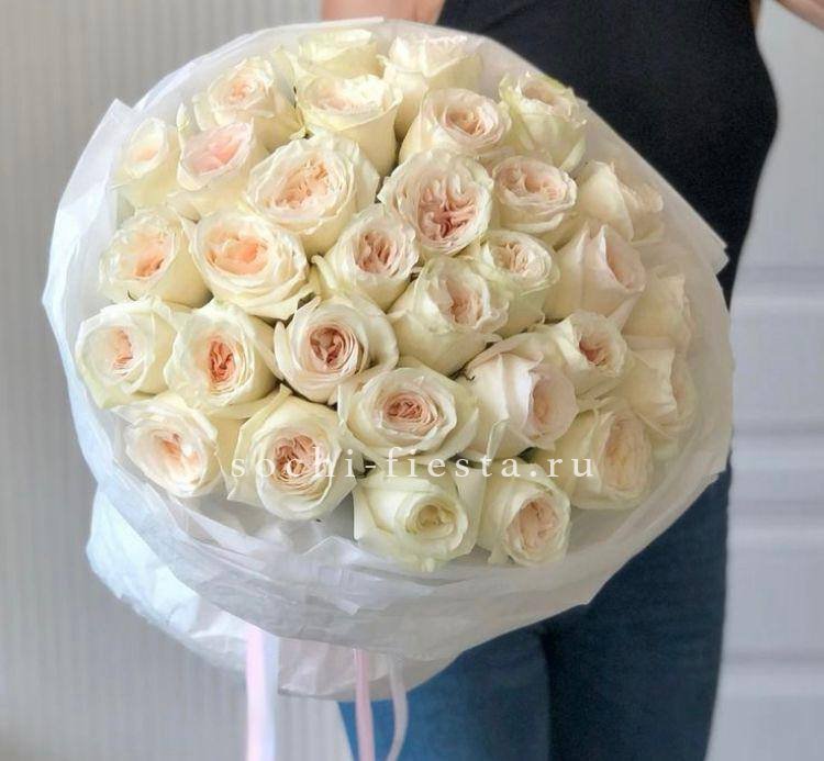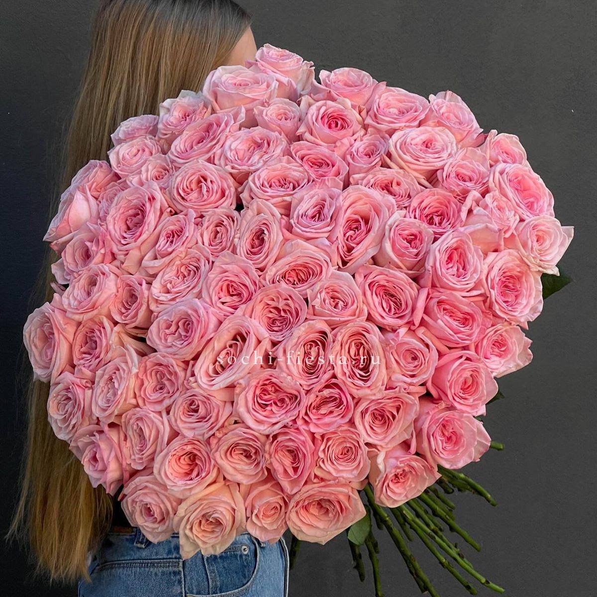 Семьдесят пять роз O'Hara формируют объемную композицию с плотно набитыми бутонами. Классическая подача под ленту сохраняет чистоту формы и выразительность каждого цветка.
