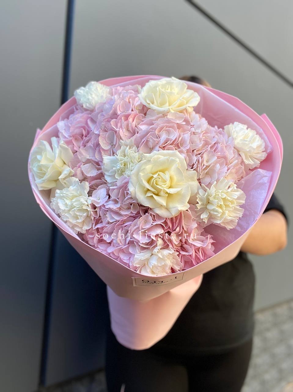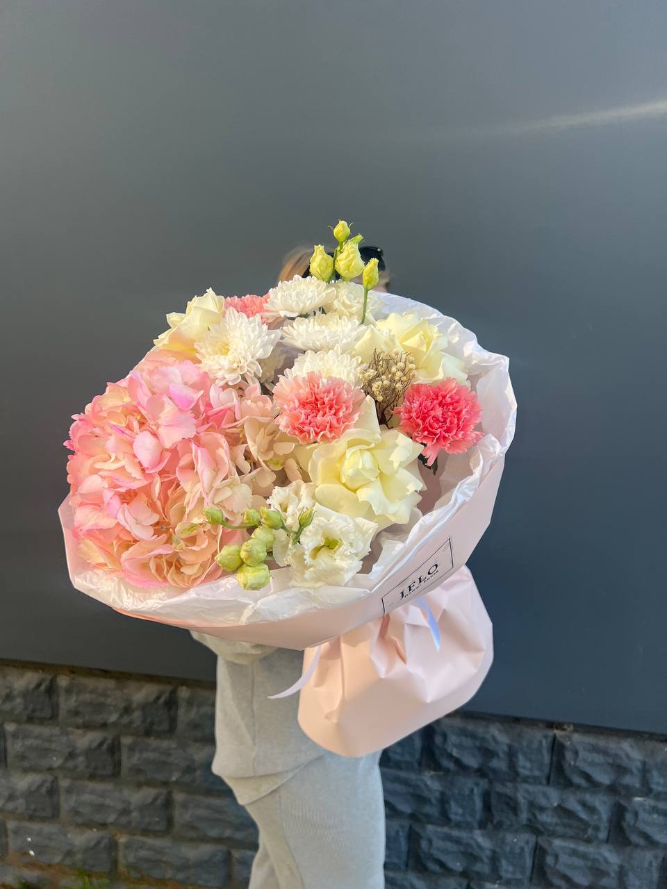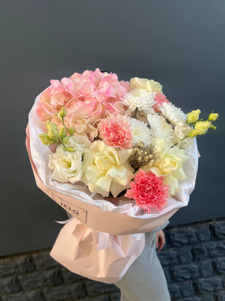 Воздушная композиция с пышной гортензией и розами Джумилия создает объемный силуэт. Маттиола и альстромерия добавляют легкости, а бомбастик вносит яркие акценты в общую структуру букета.