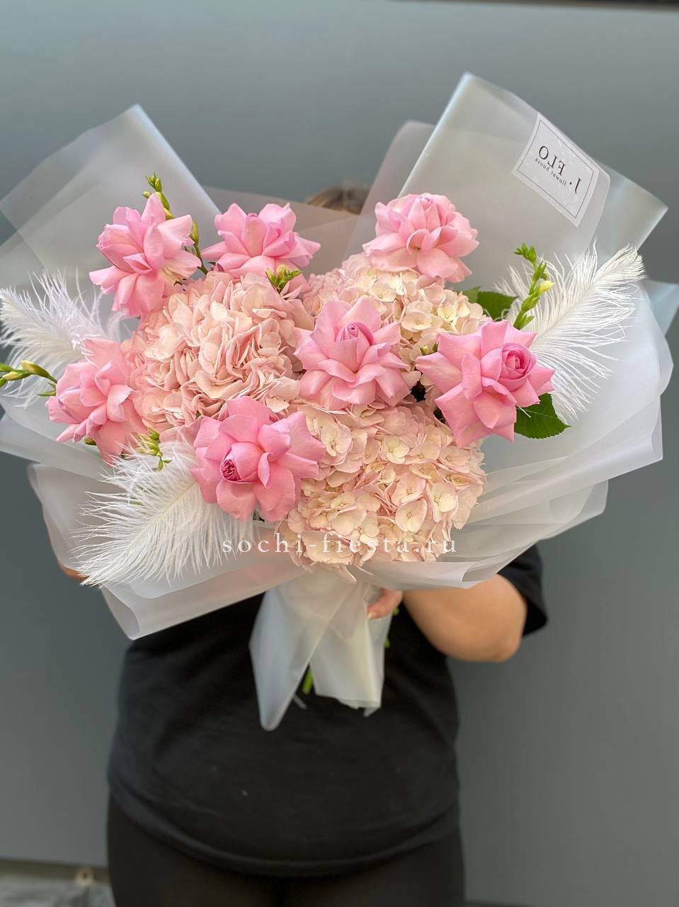 гортензия, розы джумилия, бомбастик, альстромерия, маттиола, чико, авторское оформление.