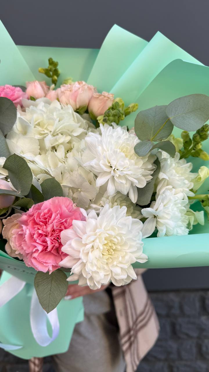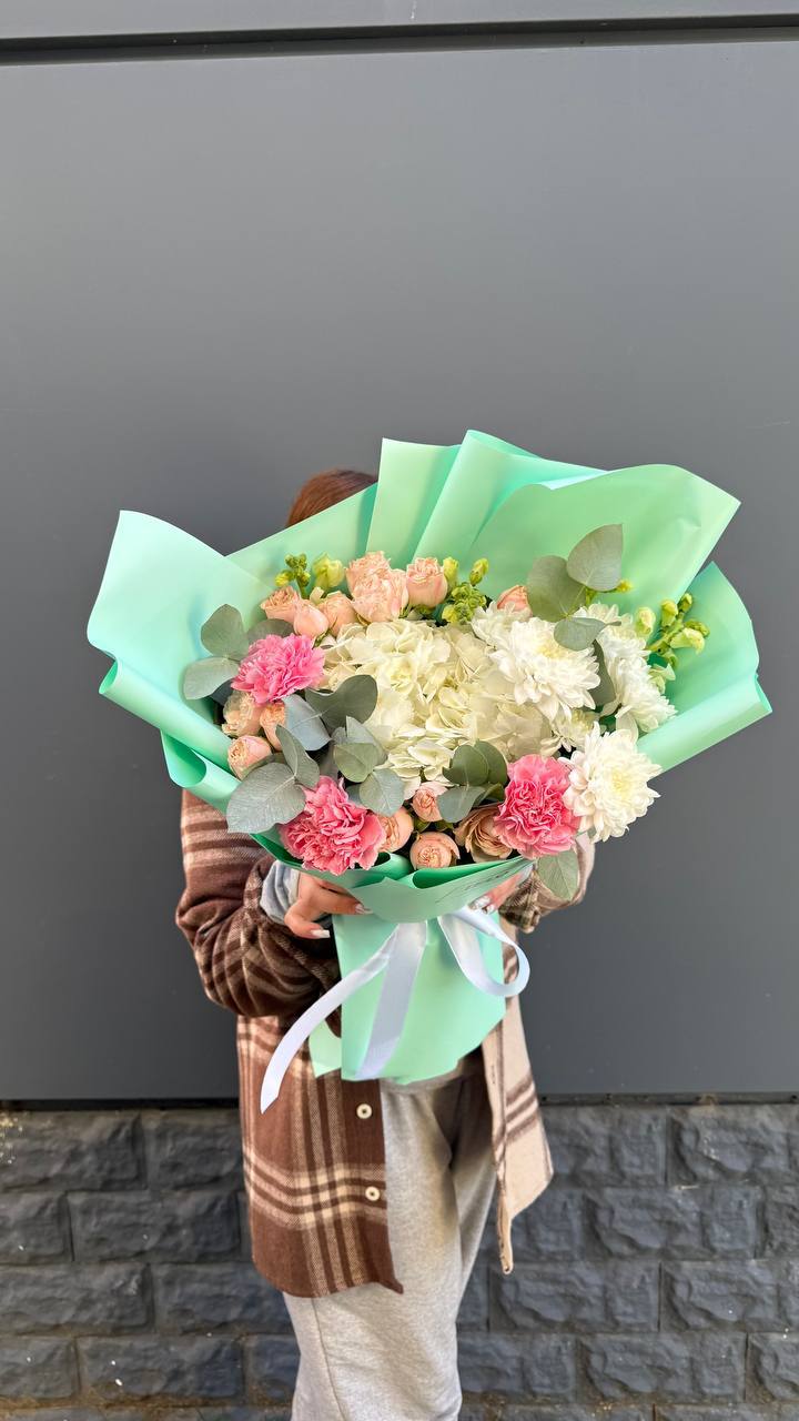 Плотная сборка с пышными соцветиями гортензии и яркими герберами создает объемный силуэт. Маттиола и лимониум добавляют воздушности по краям, а диантусы заполняют центр мягкими переходами.