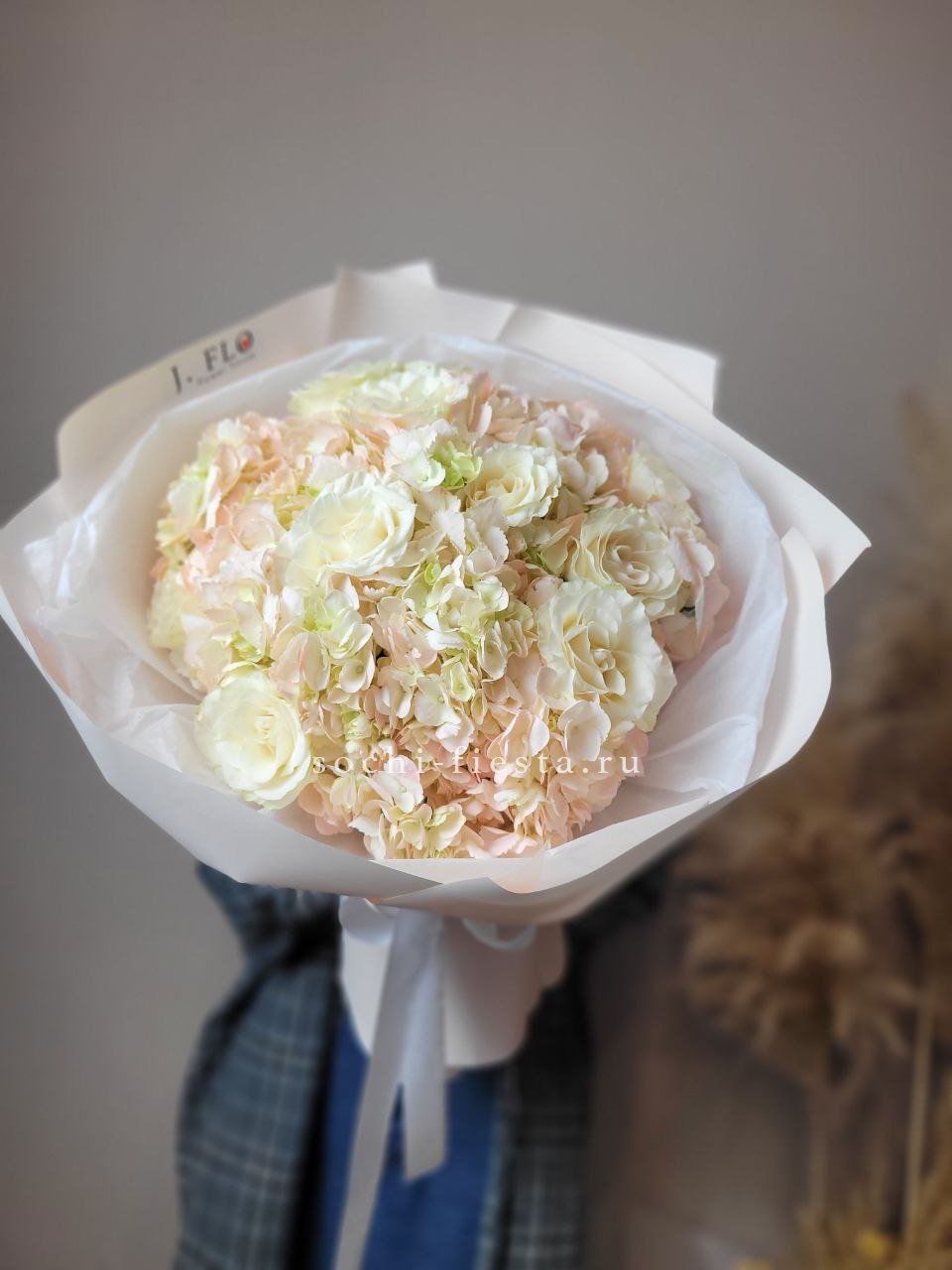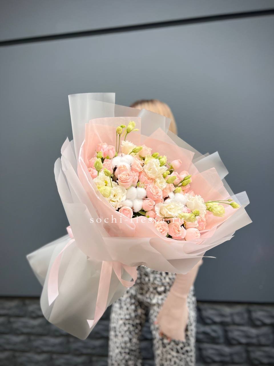 Белые розы и эустома образуют воздушный объем, где каждый бутон дышит свободно. Диантус добавляет графичности, а эвкалипт создает прохладную дымку по краям. Букет для тех, кто ценит легкость и современную флористику.