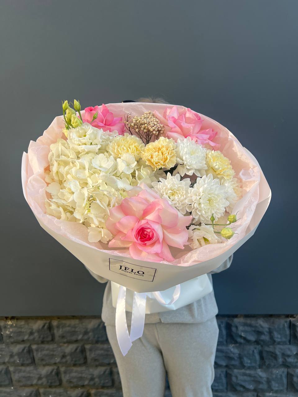 диантус, гербера, кустовая роза, роза белая, лимониум (замена в несезон), дельфиниум/маттиола/львиный зев/гладиолус (замена в несезон), лента, авторская упаковка.
