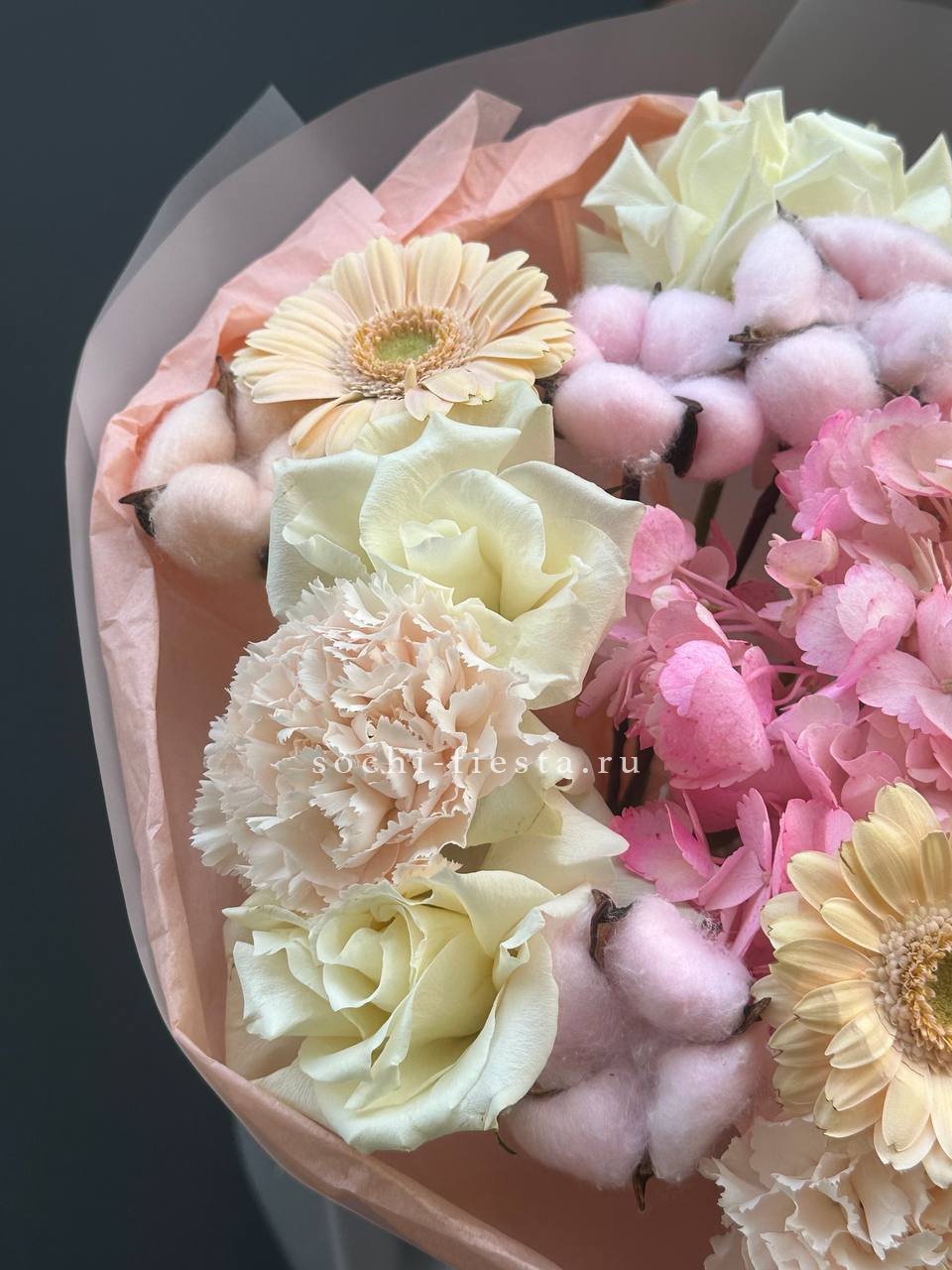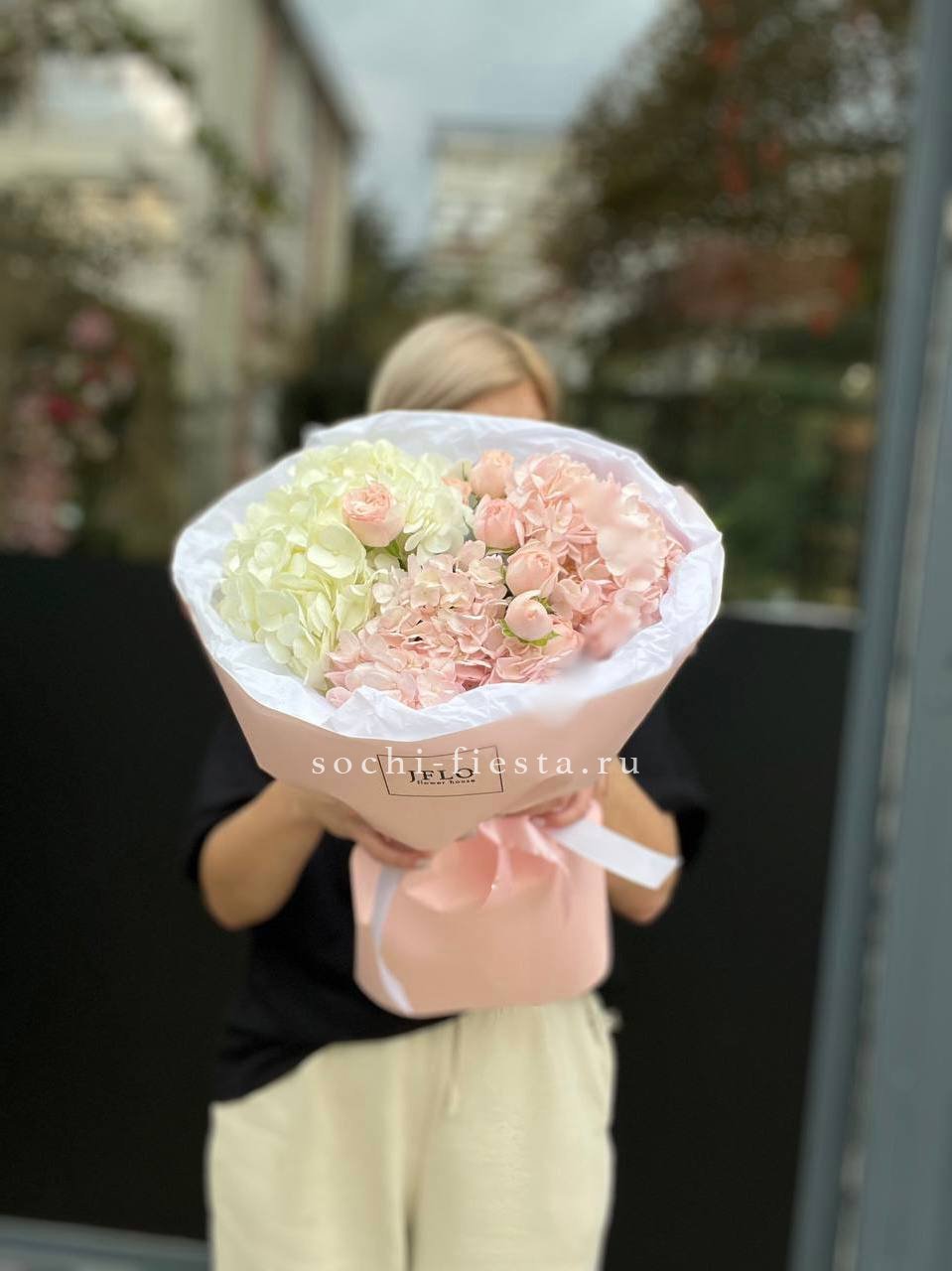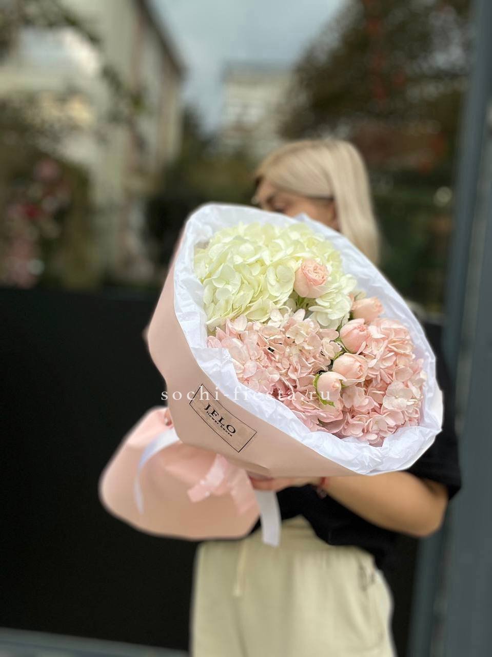 Гортензия образует пышную основу, сквозь которую проступают светлые головки эустомы и роз. Бомбастик вносит графичность, создавая объём и глубину.