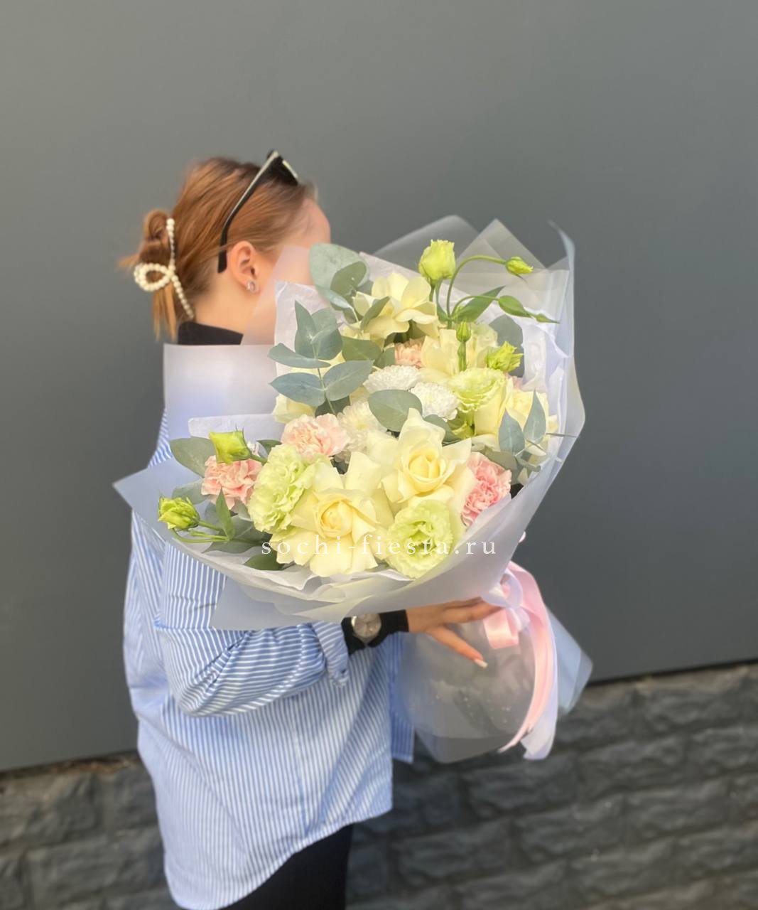 Белые розы и эустома образуют мягкую светлую основу, которая успокаивает взгляд. Диантус и хризантема наполняют букет объёмом, а эвкалипт вносит природную свежесть.