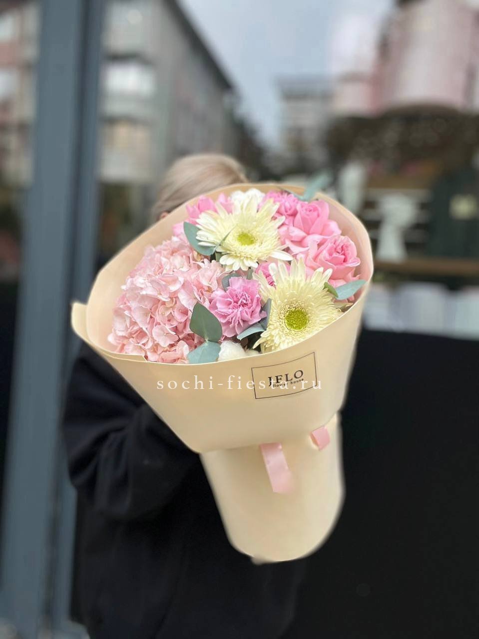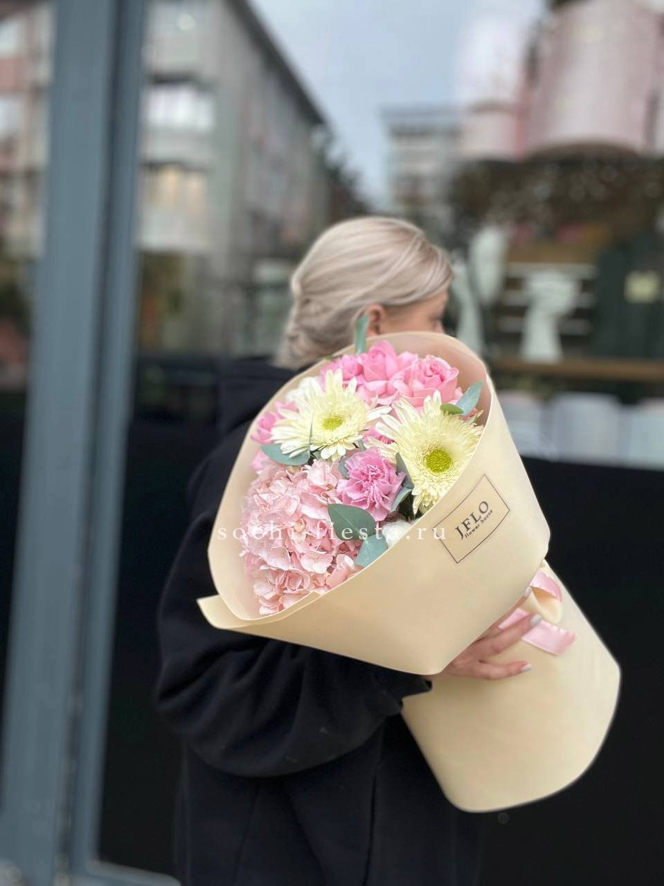 Пышная шапка из гортензии и пионовидных роз собрана с филигранной точностью. Диантус и эустома создают воздушные переходы между крупными соцветиями, а озотамнус добавляет графичные вертикали. Букет для тех, кто понимает язык авторской флористики.