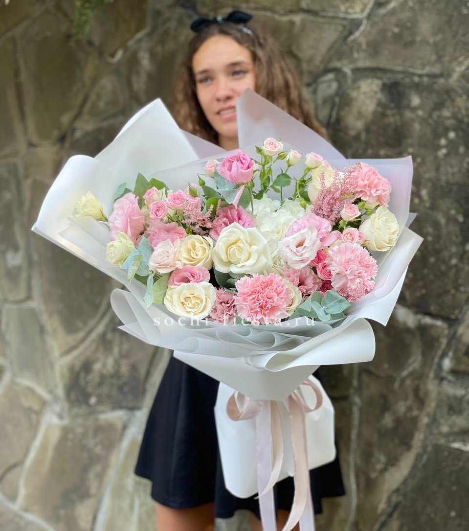 диантусы, розы, эустома, гортензия, эвкалипт, вспомогательные цветы, лента, корейская пленка.
