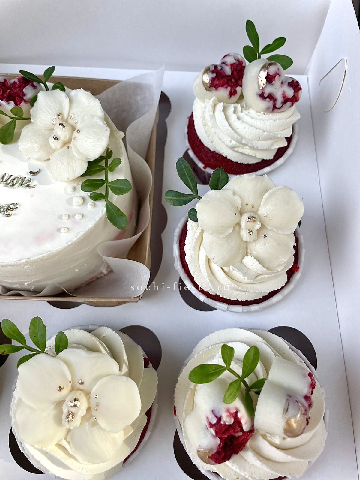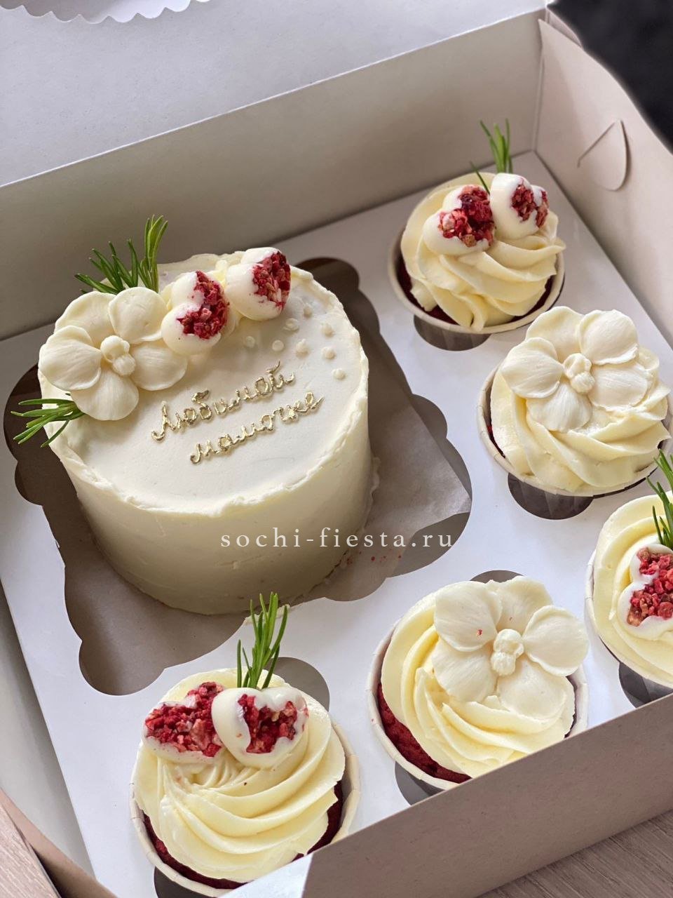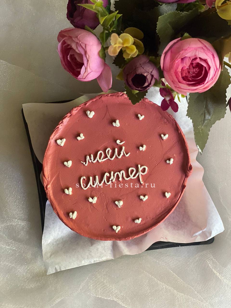 Компактный десерт ручной работы с весенним оформлением в красно-белой гамме. Кремовая текстура и графичный декор создают праздничное настроение. Два варианта начинки позволяют выбрать любимый вкус.